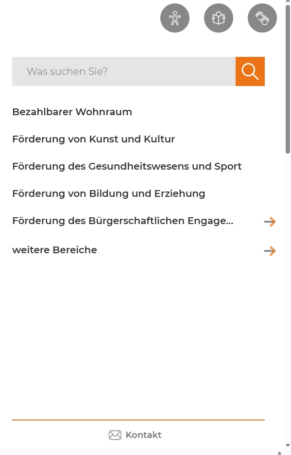 In dem Menü sind oben kleine Symbole. Mit den Symbolen kommen Sie zur Barriere-Freiheit, Leichten Sprache und Gebärden-Sprache.